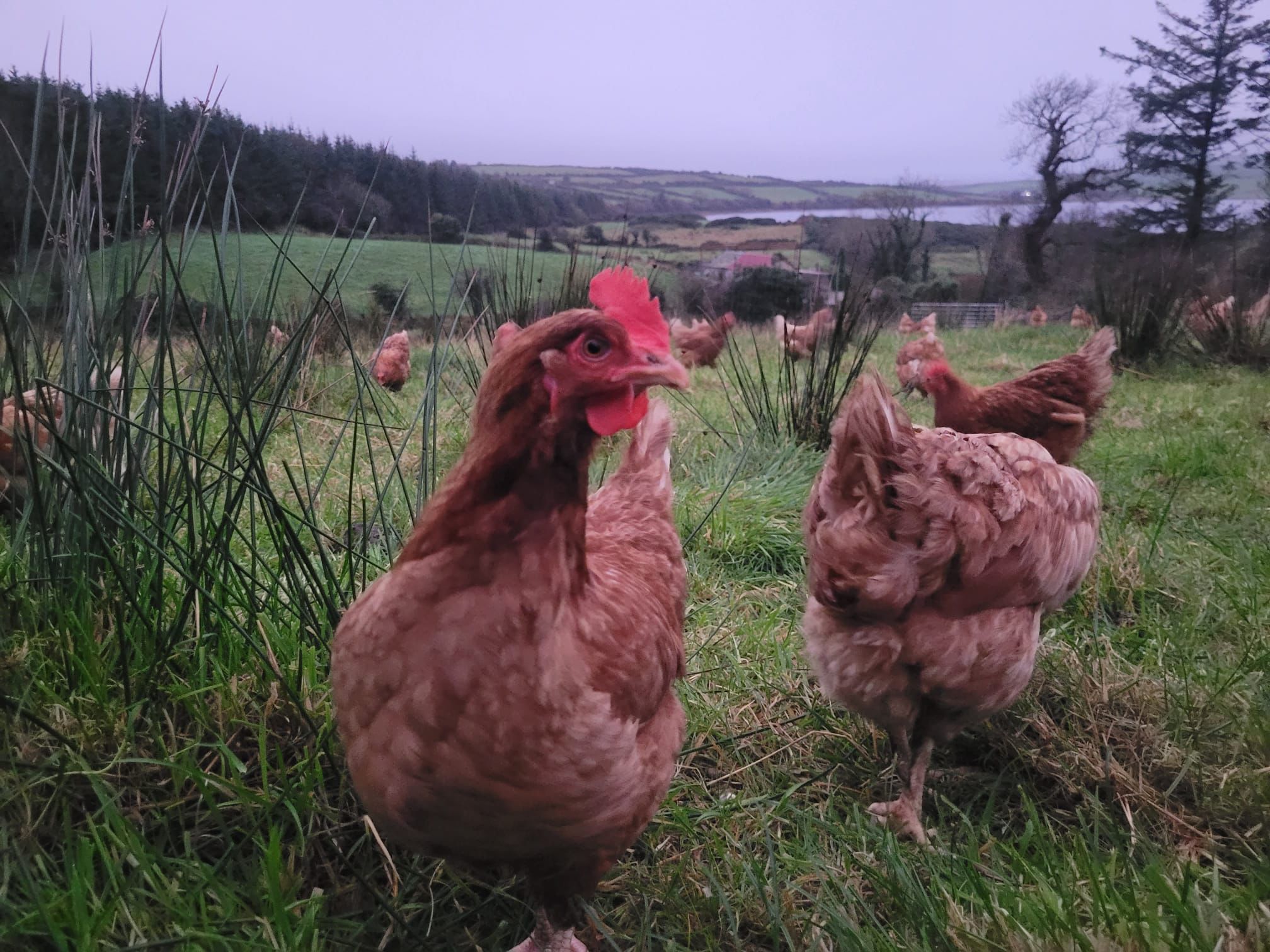 At Mulroy Meadow Farm, home to around two hundred hens, living conditions are completely different. The birds are kept within mobile fencing that is moved every second day, which gives them continual access to the fresh ground. In line with bird flu prevention regulations, hens stay in shelter during winter months; however, as soon as the housing order is done, they are returned to the open pasture. To keep hens occupied and mentally stimulated, Cathal and Michelle provide them with so-called ‘boredom busters’. “If hens are stuck in a shed and bored, it’s no surprise they start pecking each other,” Cathal said, explaining that most animals need a certain amount of stimulation per day. “Pecking gives chickens something to do, so we provide them with seaweed twice a week and fresh vegetables from the market – products that are past their sell-by date but are still fine for animal consumption.”